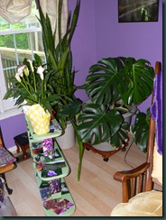 The Calla Lily in the front is new. I got it at Wegmans last week – it’s purple! It had one flower when I got it, now it has 5 with another on the way!